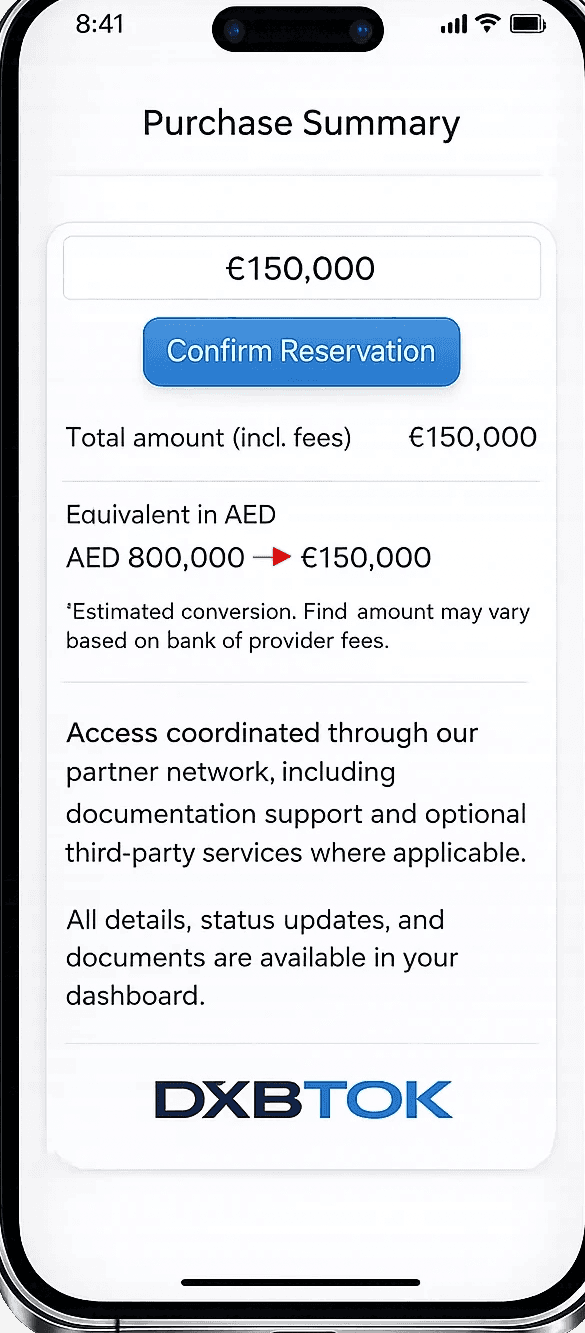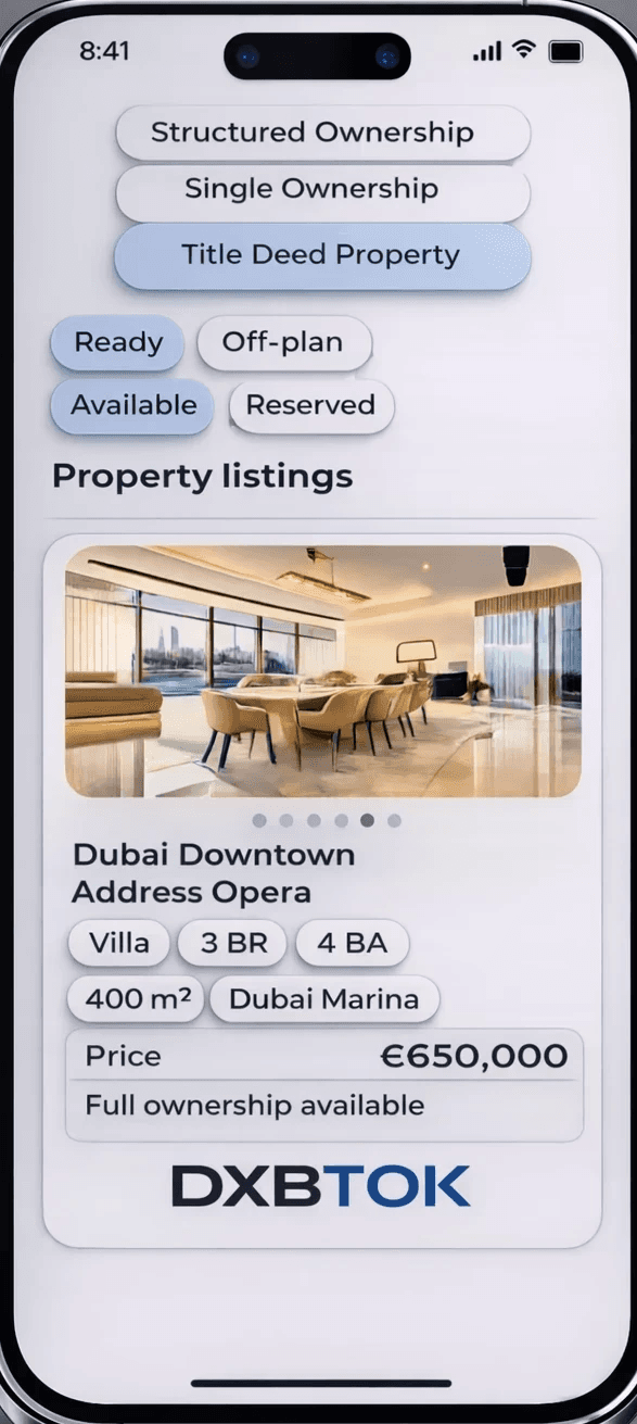 A Structured Ownership property follows DXBTOK’s guided purchase model, where access, documentation, and transaction steps are organised through a clear platform process.