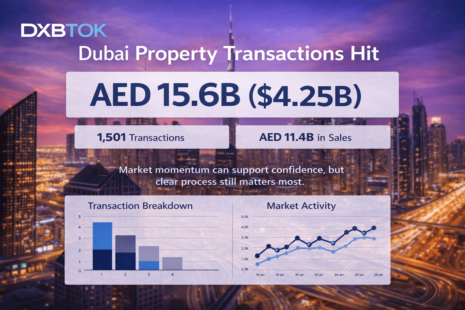 Dubai recorded AED 15.6B ($4.25B) in property transactions on January 26, described as the highest single-day real estate value on record, citing Dubai Land Department data.