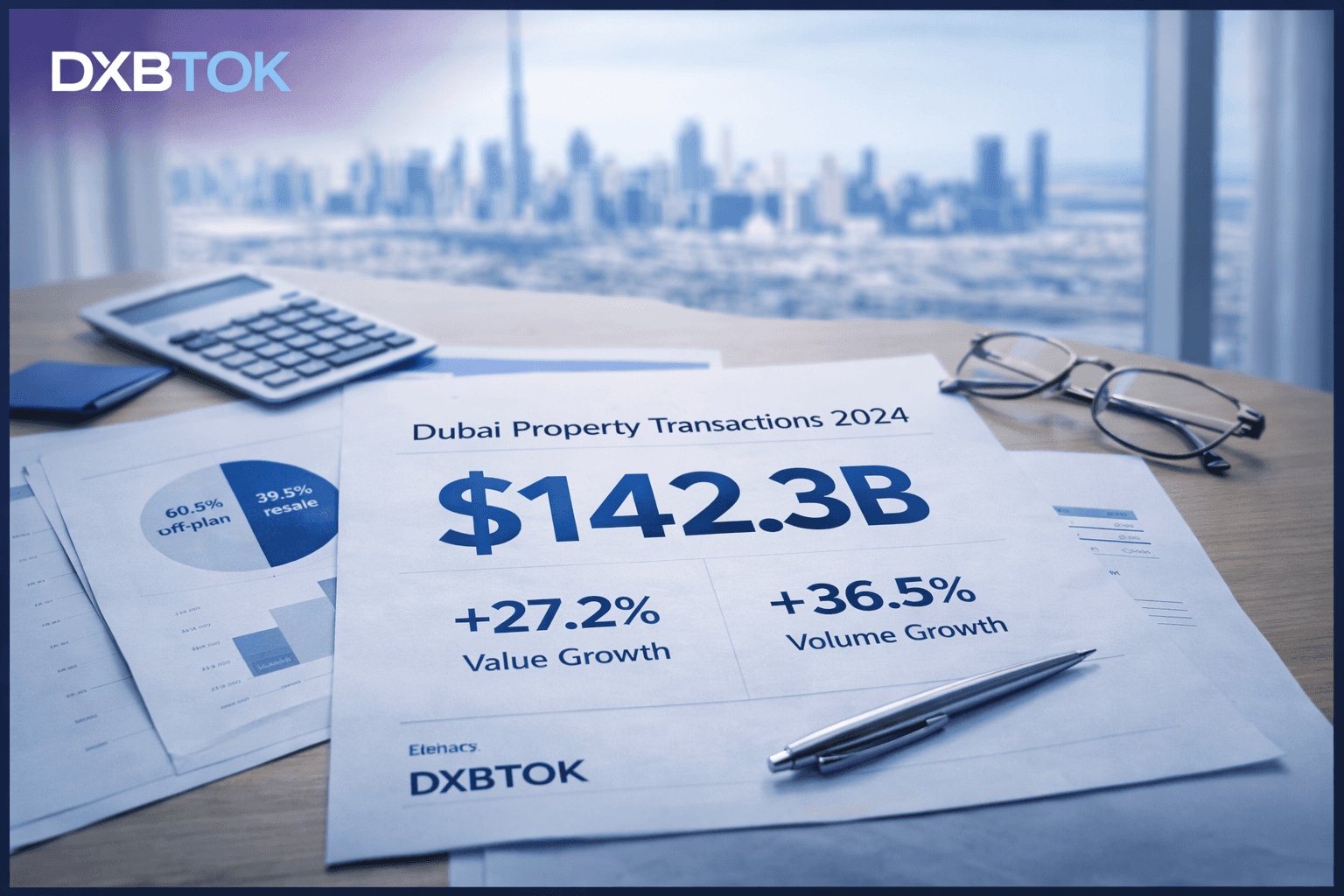 Dubai recorded 180,987 property transactions worth $142.3B in 2024, with volume up 36.5% and total value up 27.2% versus the prior year, based on the report cited by DXB News Network.